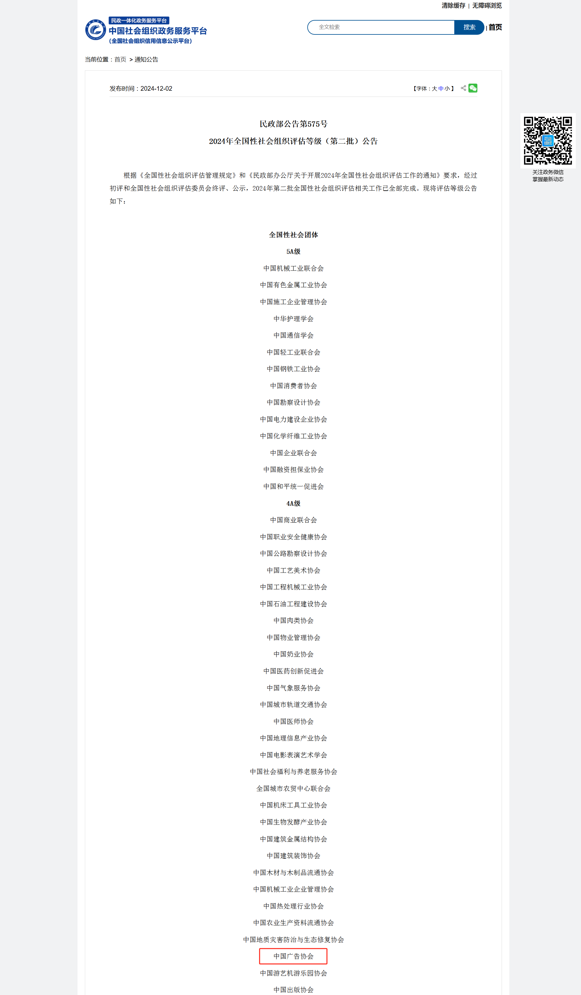 12月2日,民政部发布《2024 年全国性社会组织评估等级(第二批)公告》(民政部公告第575号),经过初评和全国性社会组织评估委员会终评、公示,beat365英国官网荣获4A级全国性社会组织称号。