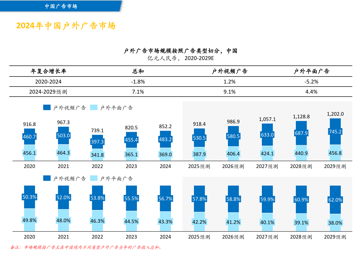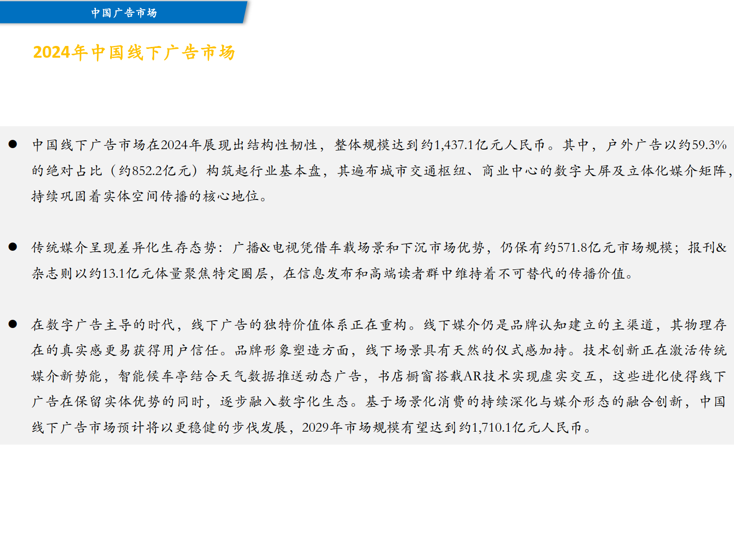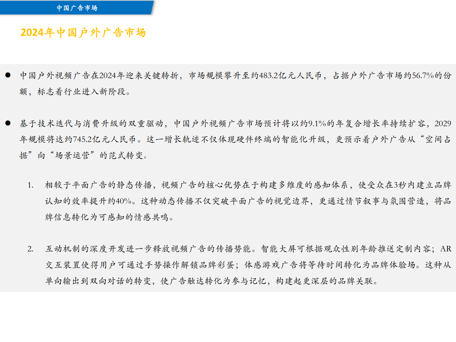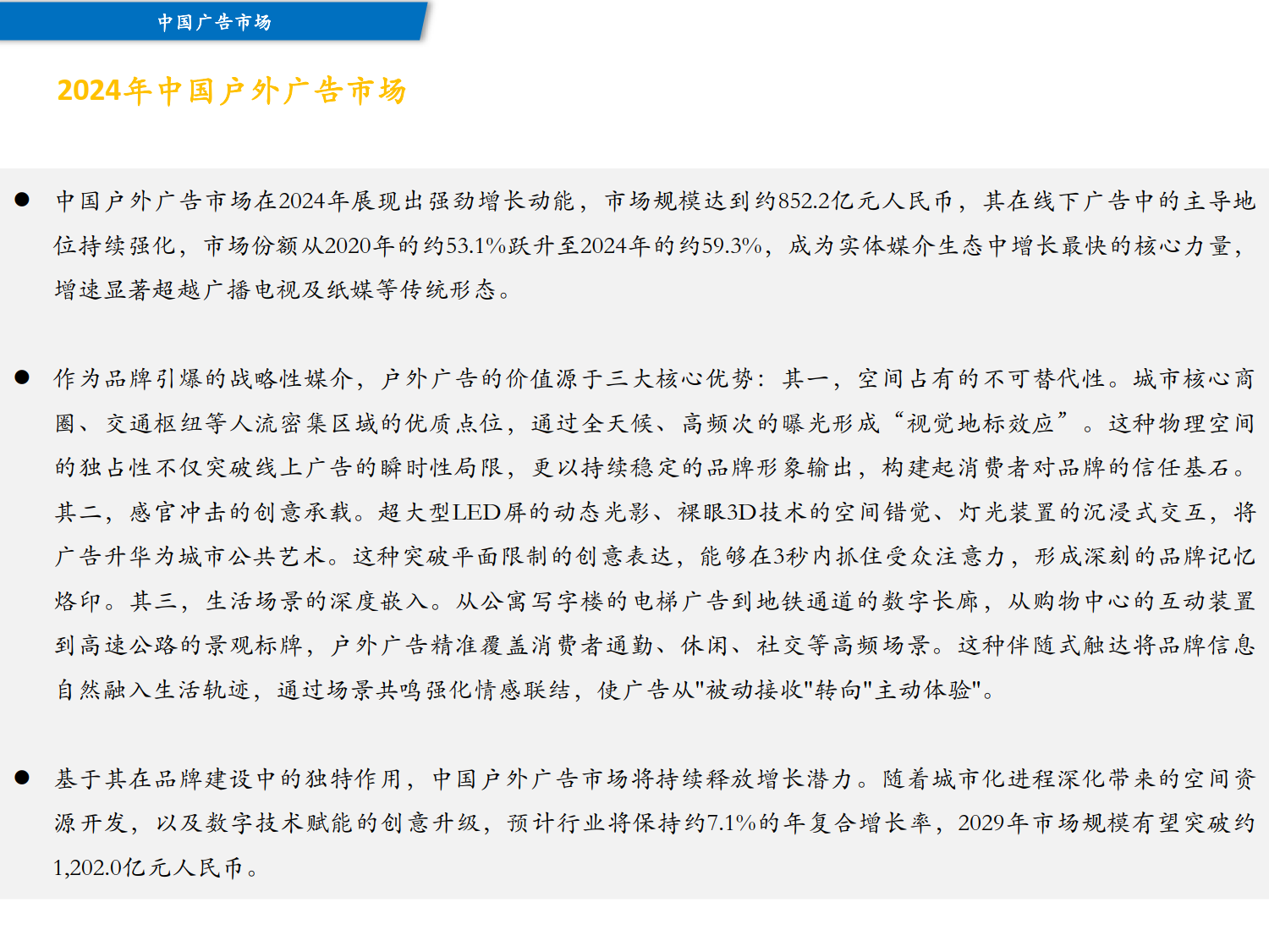 中国广告市场 2024 年规模达 1.5 万亿元人民币,线下广告中户外广告占比约 59.3%,是增长最快的核心力量。中国户外广告凭借空间占有、感官冲击和场景嵌入优势,预计 2029 年市场规模突破约 1,202.0 亿元人民币,其中户外视频广告增长势头强劲,年复合增长率预计约 9.1%。报告认为,无论是全球还是中国,户外广告都在技术赋能和市场需求变化的背景下,展现出巨大的发展潜力,正从传统曝光媒介向品效协同的广告基础设施转变。