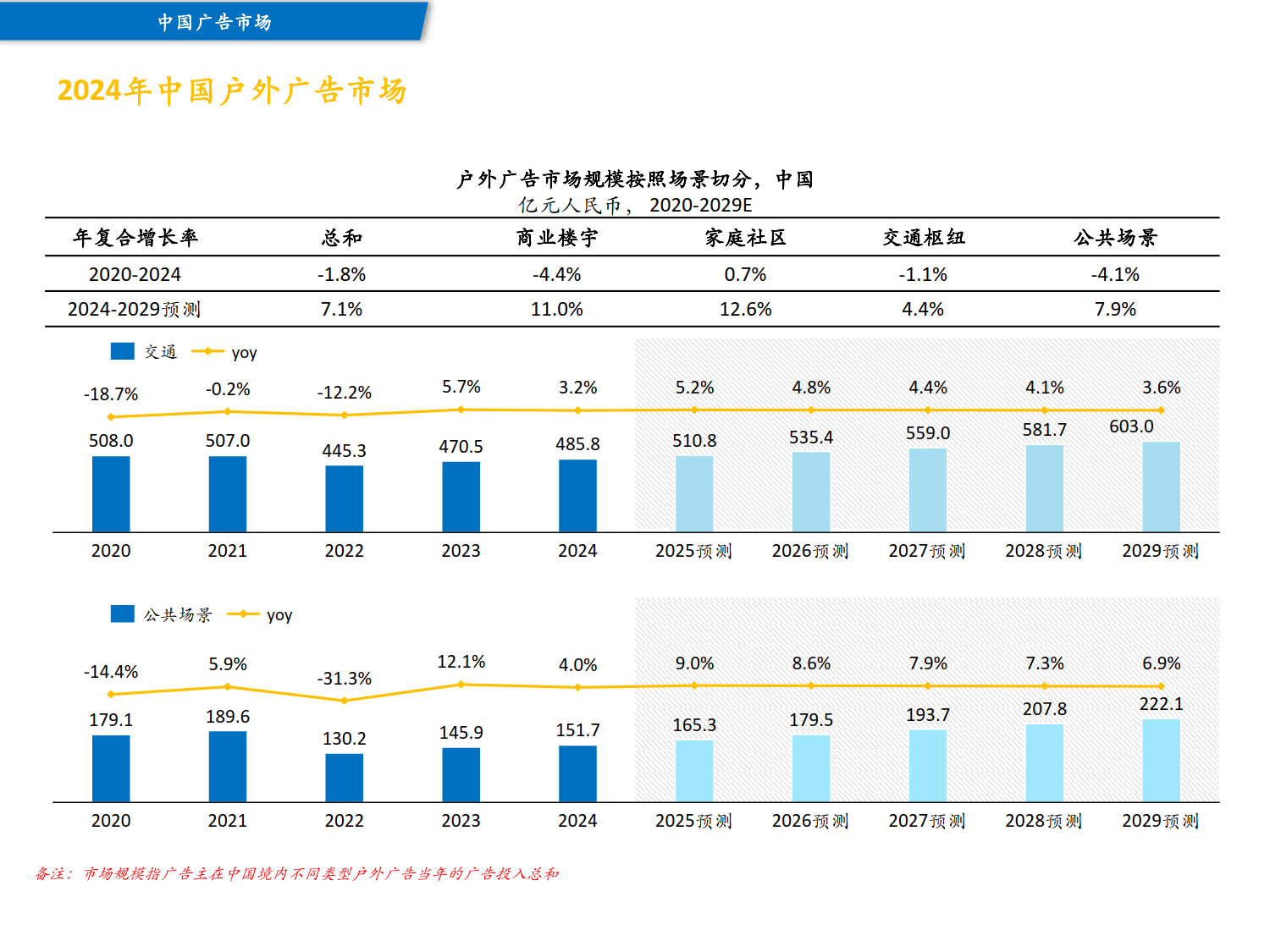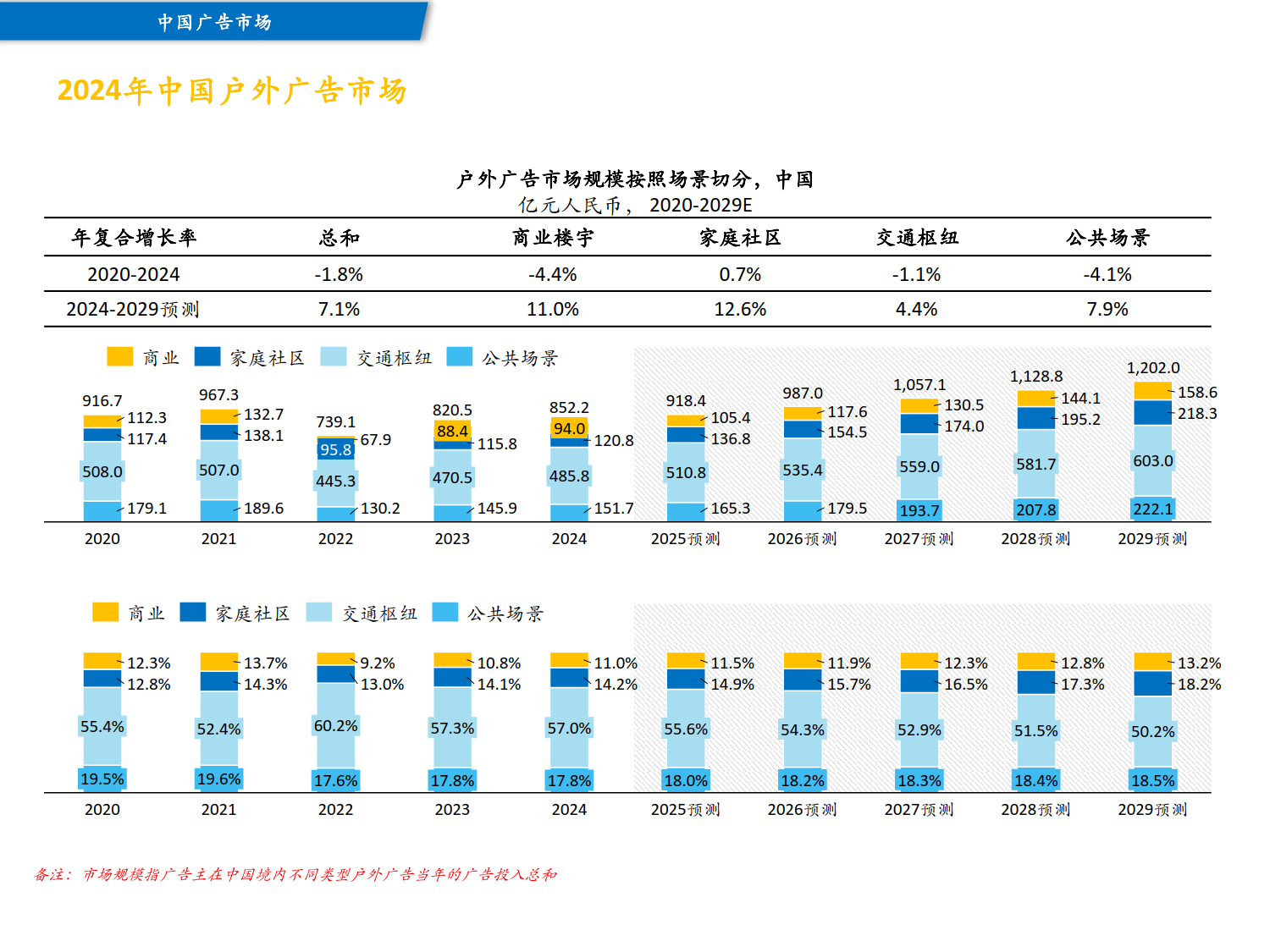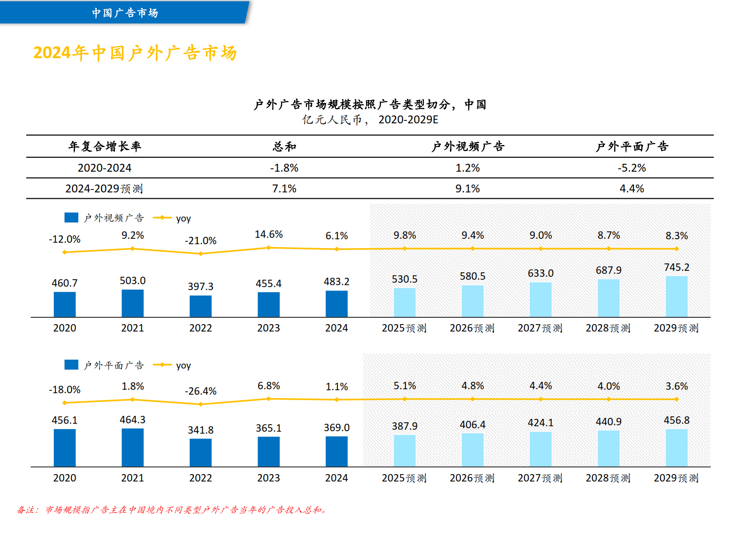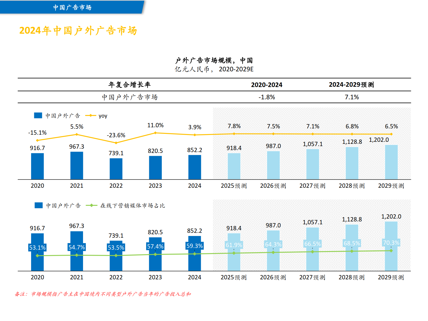 中国广告市场 2024 年规模达 1.5 万亿元人民币,线下广告中户外广告占比约 59.3%,是增长最快的核心力量。中国户外广告凭借空间占有、感官冲击和场景嵌入优势,预计 2029 年市场规模突破约 1,202.0 亿元人民币,其中户外视频广告增长势头强劲,年复合增长率预计约 9.1%。报告认为,无论是全球还是中国,户外广告都在技术赋能和市场需求变化的背景下,展现出巨大的发展潜力,正从传统曝光媒介向品效协同的广告基础设施转变。