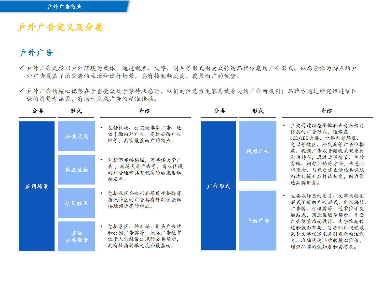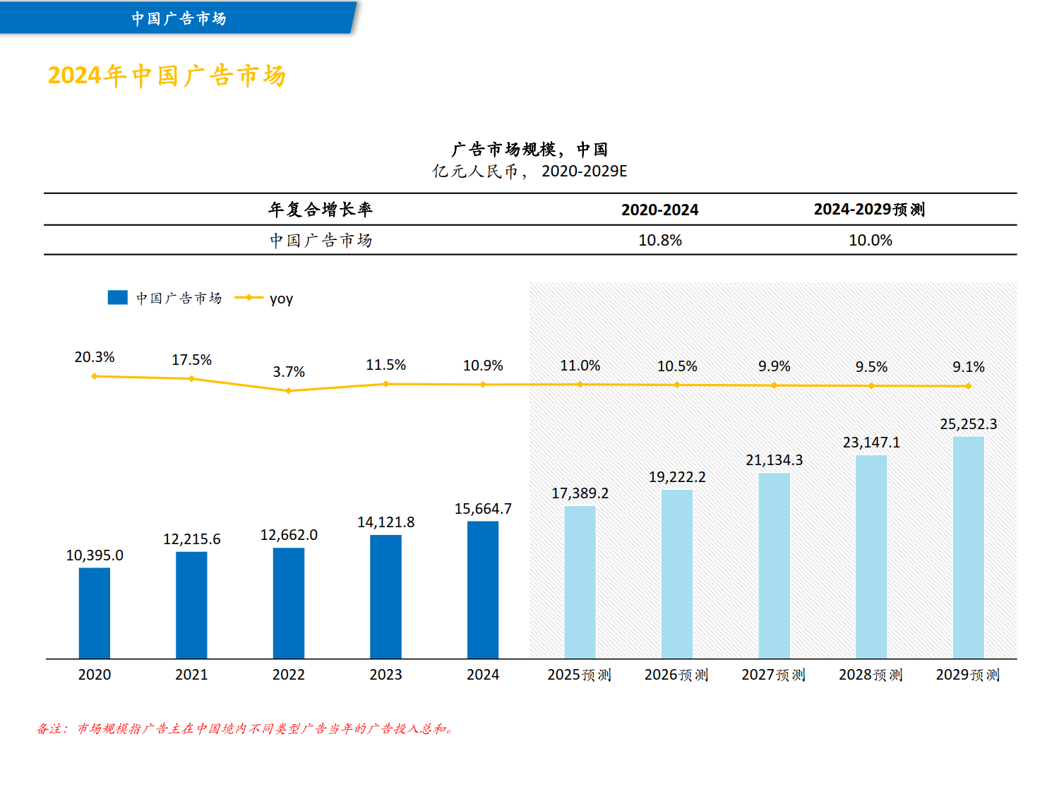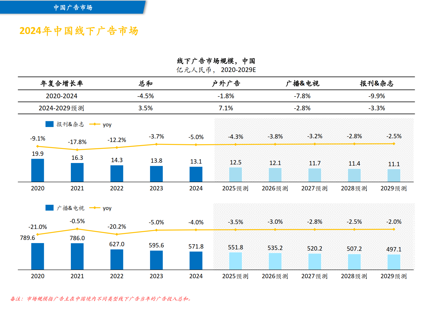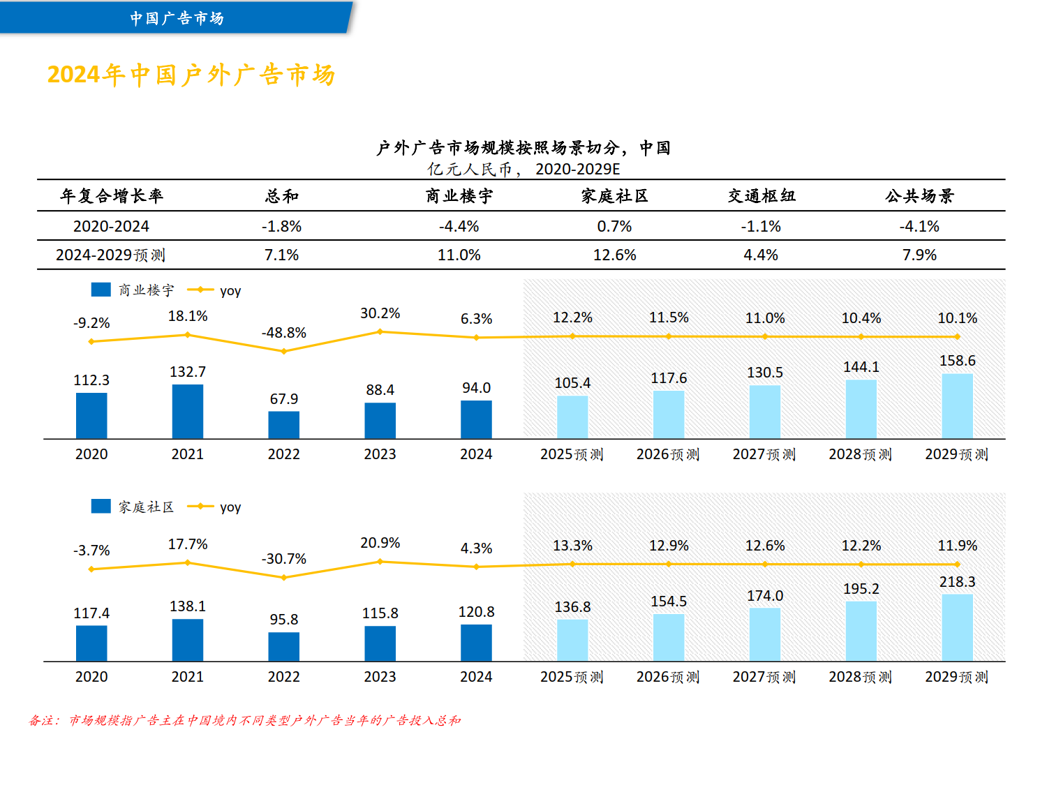 中国广告市场 2024 年规模达 1.5 万亿元人民币,线下广告中户外广告占比约 59.3%,是增长最快的核心力量。中国户外广告凭借空间占有、感官冲击和场景嵌入优势,预计 2029 年市场规模突破约 1,202.0 亿元人民币,其中户外视频广告增长势头强劲,年复合增长率预计约 9.1%。报告认为,无论是全球还是中国,户外广告都在技术赋能和市场需求变化的背景下,展现出巨大的发展潜力,正从传统曝光媒介向品效协同的广告基础设施转变。