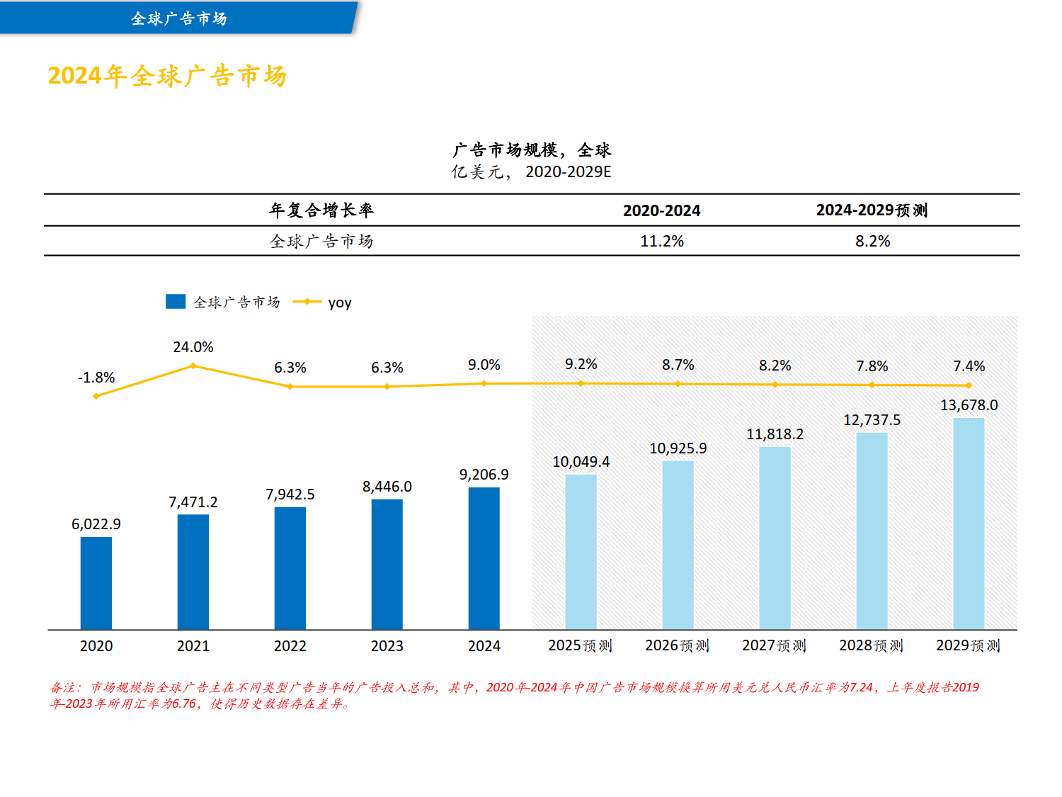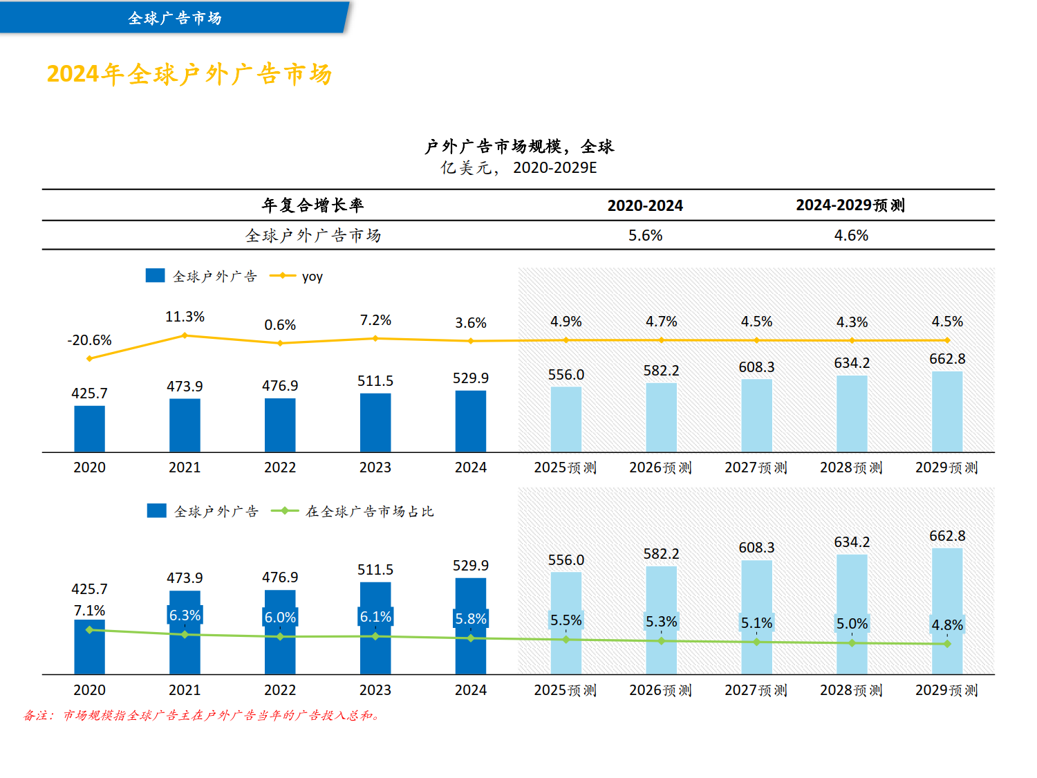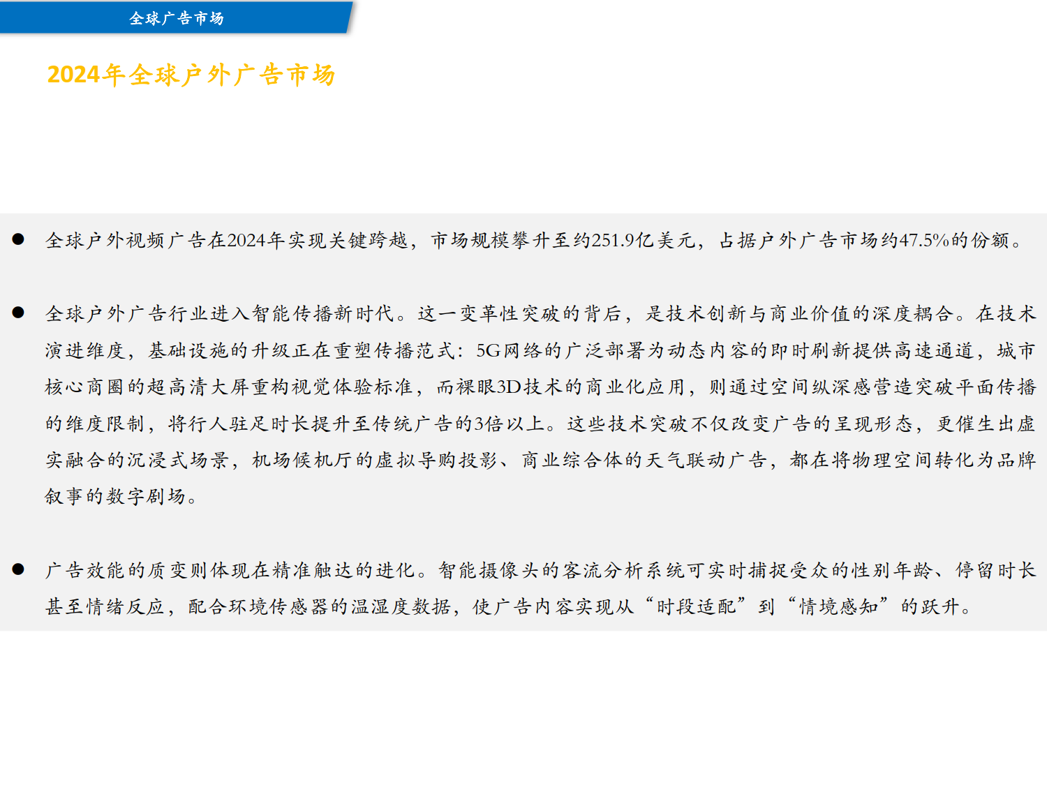 beat365英国官网联合权威机构打造的“2024年全球及中国户外广告市场报告”,报告显示,全球广告市场在 2020 - 2024 年规模从约 6,022.9 亿美元扩张至约 9,206.9 亿美元,预计 2029 年将达约 13,678.0 亿美元,技术变革、年轻消费群体需求变化和媒介形态革新是主要推动力。全球户外广告行业规模 2024 年回升至约 529.9 亿美元,其中户外视频广告占比约 47.5%,行业进入智能传播新时代,技术创新提升广告呈现效果和精准触达能力 。